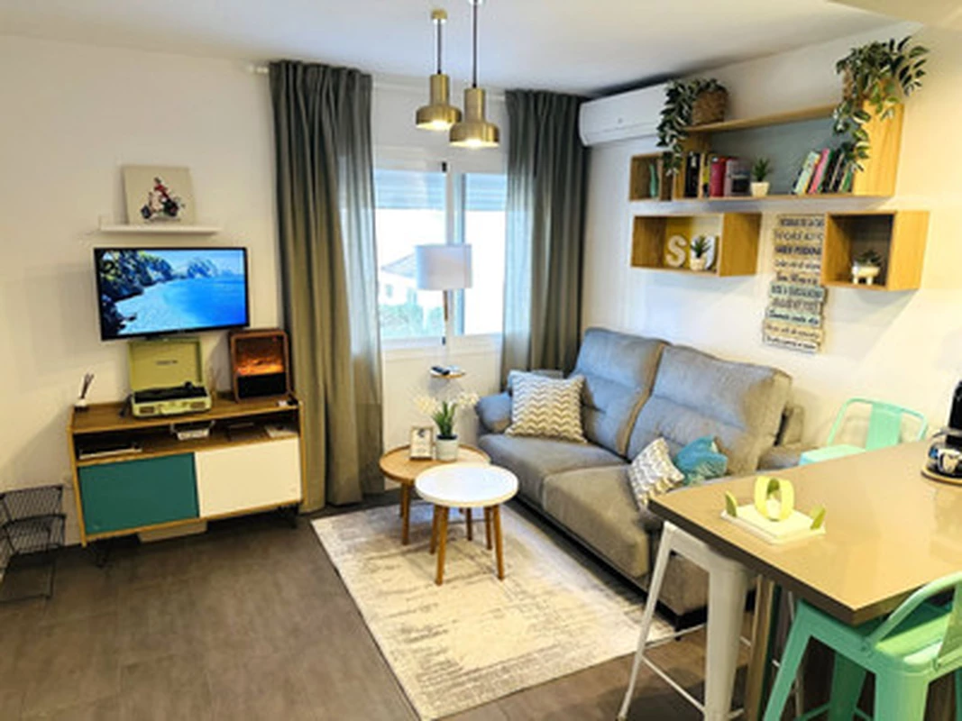Living room with sofa, TV and Bluetooth/USB record player
