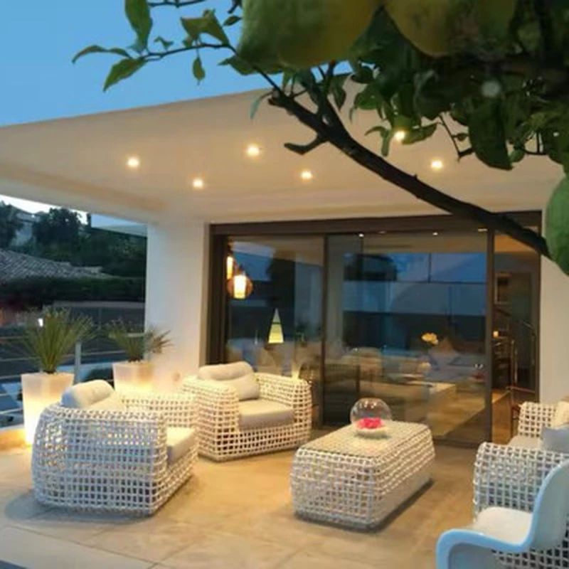 Outside, the tropical gardens surround the villa with lush vegetation, providing complete privacy. The terraces offer multiple areas to dine al fresco or simply enjoy the sun and the panoramic views. The illuminated saltwater pool becomes the heart of the property at night, creating a tranquil and elegant ambiance.