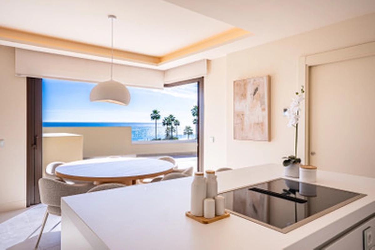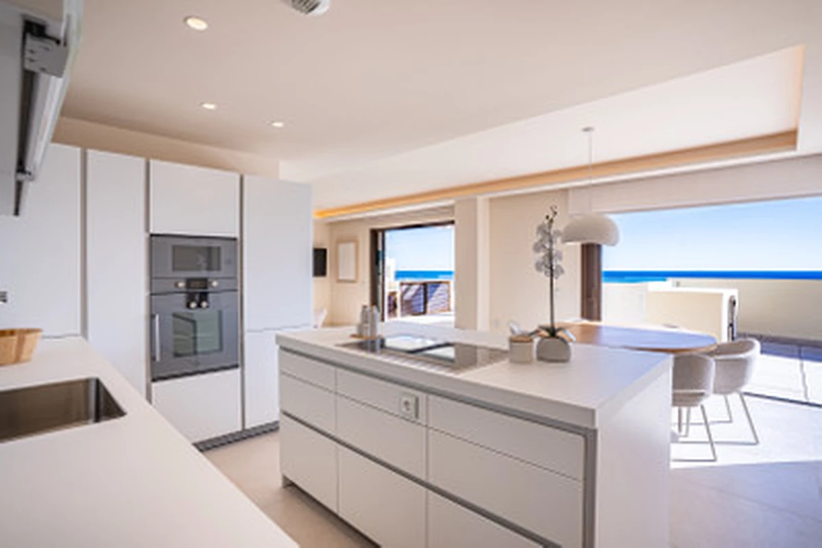 This modern 3 bed 2 bath duplex penthouse sits frontline to the beach in Estepona and offers direct access to the sand. The home has huge windows that fill the living room with natural light and a fully fitted kitchen with an island. You also get a private pool and large terrace spaces plus a private terrace off the master bedroom.